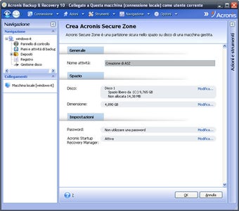 Acronis Backup & Recovery 10 Advanced Server SBS Edition consente di creare una copia esatta del disco o della partizione scelta, selezionare un livello di compressione, la tipologia di backup (totale, incrementale, differenziale) e altro ancora. Il programma permette anche di creare e gestire la Secure Zone, una partizione nascosta nella quale memorizzare i tuoi backup e ripristinare velocemente il sistema in caso di problemi.